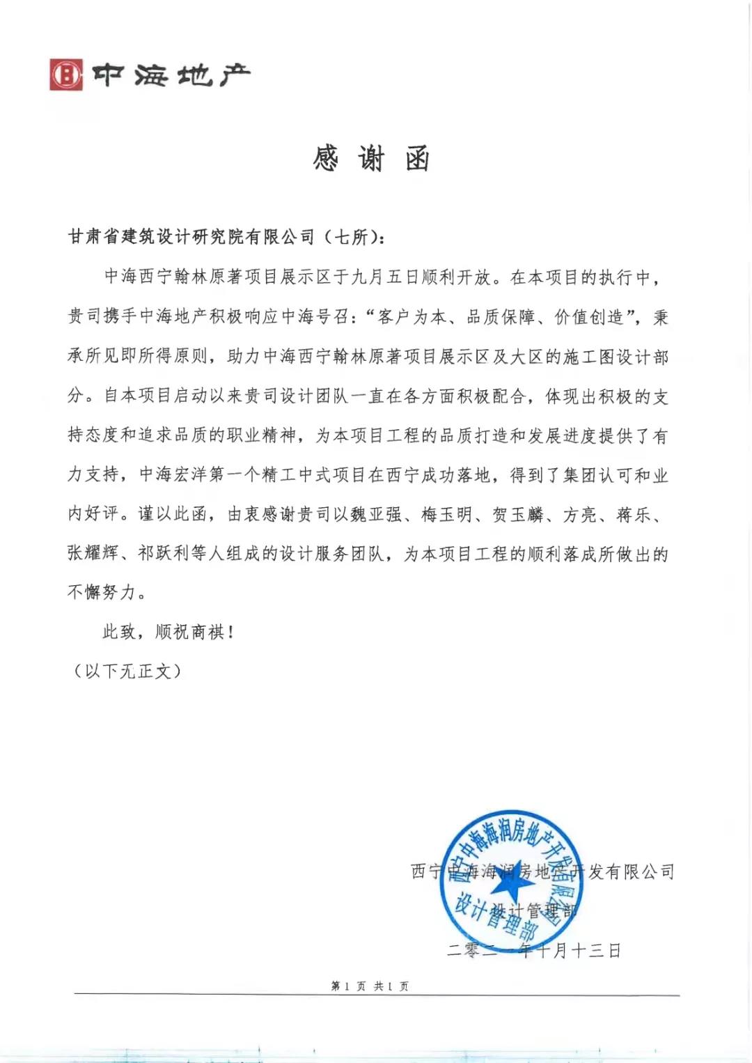 日前,建筑設(shè)計院收到來自西寧中海地產(chǎn)的一封感謝信,贊揚設(shè)計七所魏亞強、梅玉明、賀玉麟、方亮、蔣樂、張耀輝、祁躍利組成的設(shè)計團隊在中海西寧翰林原著項目展示區(qū)及大區(qū)施工設(shè)計中的突出表現(xiàn)。