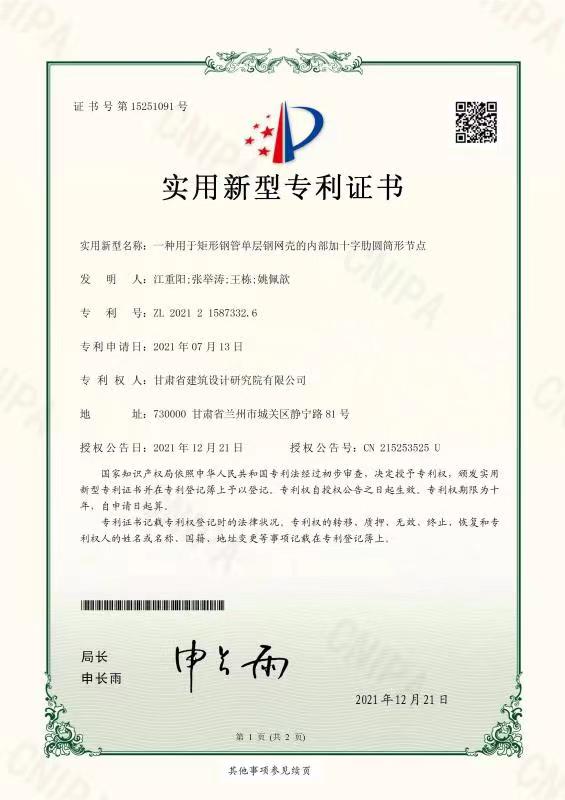 近日,從國家知識產(chǎn)權(quán)局傳來好消息,由建筑設(shè)計(jì)院總工程師張舉濤、設(shè)計(jì)四所總工程師江重陽、設(shè)計(jì)五院總工程師王棟、設(shè)計(jì)四所工程師姚佩歆聯(lián)合申報(bào)的“一種用于矩形鋼管單層鋼網(wǎng)殼的內(nèi)部加十字肋圓筒形節(jié)點(diǎn)”技術(shù),喜獲國家實(shí)用新型專利。