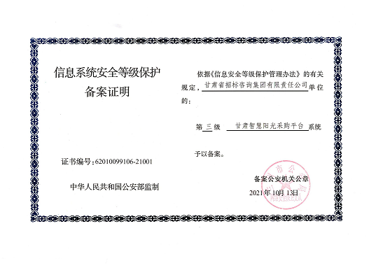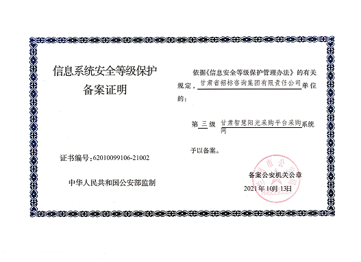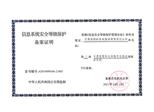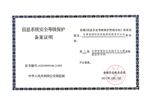 近日,由招標咨詢集團負責開發(fā)建設的甘肅智慧陽光采購平臺系統(tǒng),以及甘肅智慧陽光采購平臺采購網(wǎng)系統(tǒng)、大數(shù)據(jù)監(jiān)管系統(tǒng)、招標系統(tǒng)、保證金系統(tǒng)、專家管理系統(tǒng)通過國家三級等保認證,系統(tǒng)管理安全能力獲得業(yè)界最高標準。