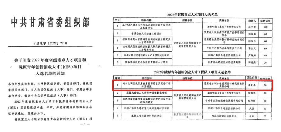 近日,省委組織部印發(fā)了《2022年度省級重點人才項目和隴原青年創(chuàng)新創(chuàng)業(yè)人才(團(tuán)隊)項目入選名單》,甘肅省水利水電勘測設(shè)計研究院有限責(zé)任公司申報的《南水北調(diào)西線甘肅省水資源需求及配套工程體系研究》成功入選“2022年隴原青年創(chuàng)新創(chuàng)業(yè)人才(團(tuán)隊)項目”,是集團(tuán)公司唯一入選項目。