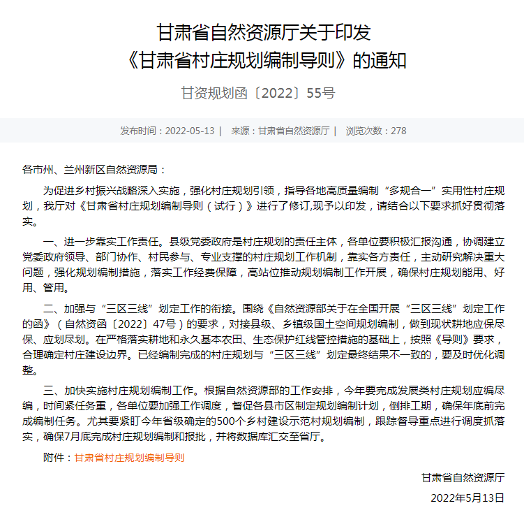 為深入貫徹習(xí)近平總書記視察甘肅重要講話和指示精神,落實省委、省政府關(guān)于村莊規(guī)劃工作部署,促推鄉(xiāng)村振興戰(zhàn)略深入實施,指導(dǎo)各地高質(zhì)量編制“多規(guī)合一”實用性村莊規(guī)劃。近日,由甘肅省自然資源廳牽頭組織,甘肅省城鄉(xiāng)規(guī)劃設(shè)計研究院有限公司參與起草的《甘肅省村莊規(guī)劃編制導(dǎo)則》正式印發(fā)實施。