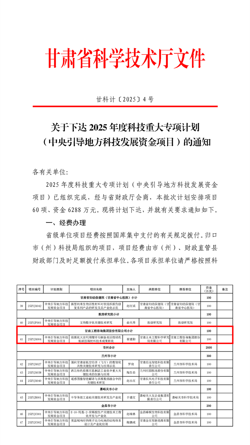 近日,甘肅省科技廳公布了2025年度科技重大專項(xiàng)計(jì)劃(中央引導(dǎo)地方科技發(fā)展資金項(xiàng)目)立項(xiàng)名單,土木工程院主持申報(bào)的“資源化大宗利用煤矸石制備高活性綠色低碳膠凝材料技術(shù)成果轉(zhuǎn)化”項(xiàng)目成功立項(xiàng)。